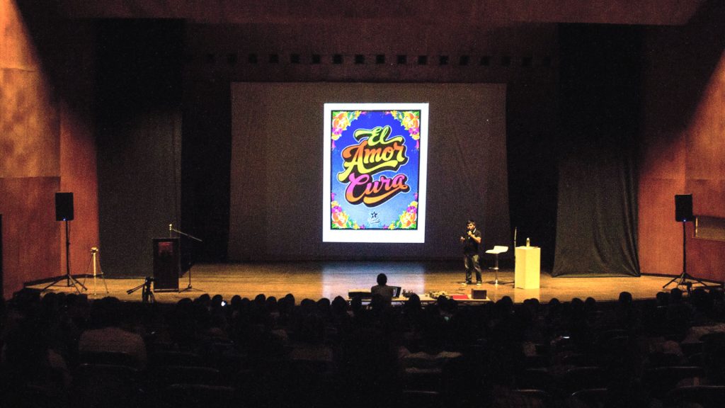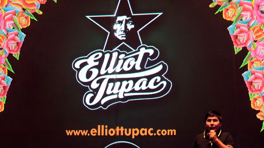 Elliot Túpac destacado pintor, cartelista, tipógrafo y muralista peruano, comienza su conferencia mostrando una recopilación de carteles Chicha que ha realizado a lo largo de los años, con una gráfica colorida y tipografías como protagonistas que se inspiran principalmente en la cultura y la música. Túpac crea estas piezas desde un pensamiento consciente que representa manifestaciones culturales emergentes. Él se orienta de diferentes elementos como los bordados Huanca y la psicodelia de las canciones que son mayormente música chicha, que tiene mucho que ver con la música Andina pero que mezcla otros sonidos como guaracha, también con sonidos cubanos y colombianos.