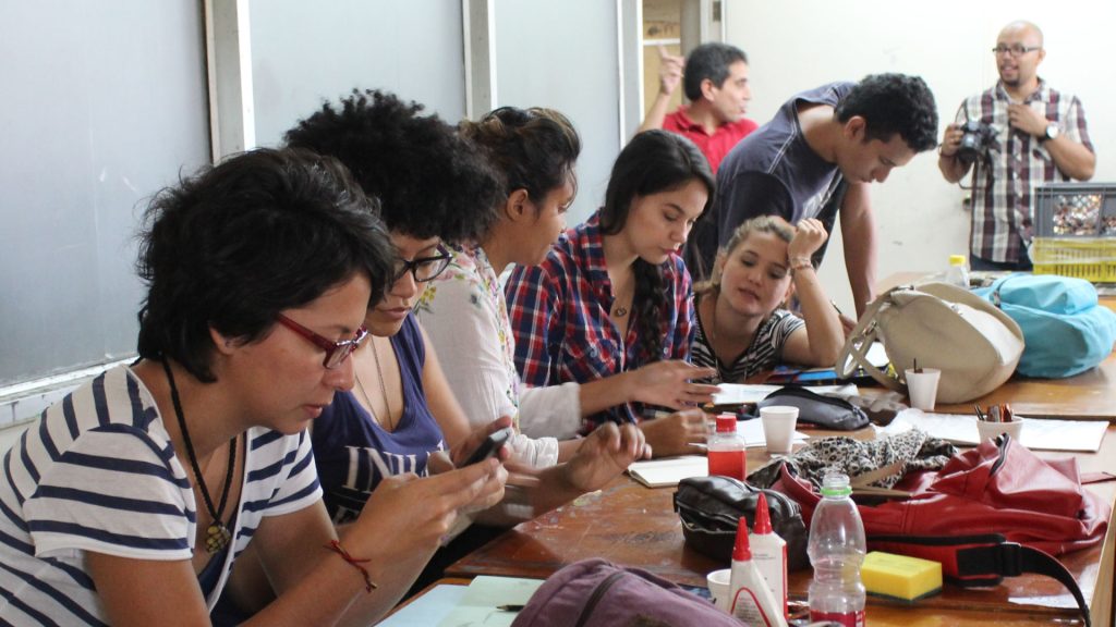 “El taller fue un trabajo de duplas. Se realizó un cartel con dos palabras escogidas al azar, las palabras surgieron de una lluvia de ideas de palabras que representaran la ciudad de Cali”