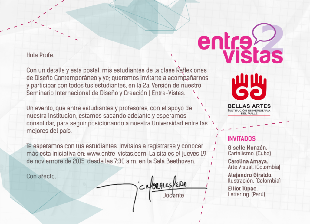 Un espacio académico de conferencias, talleres y muestras, creado y realizado por los estudiantes de sexto semestre del programa académico de Diseño Gráfico de la Facultad de Artes Visuales y Aplicadas de Bellas Artes, en la asignatura “Reflexiones del Diseño Contemporáneo”, ofrecida por el docente Juan Carlos Morales Peña.